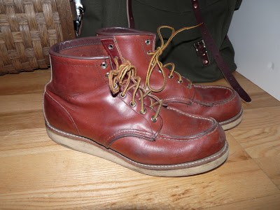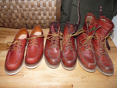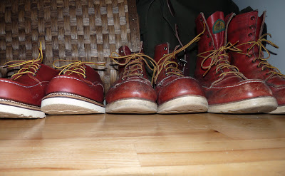 three decades of red wing shoes from my wardrobe. from left to right: the newest, a two days old model 8103 – i love the new style of the relaunched rws oxfords –, in the middle a 8131 from the 90s and on the right my beloved 877 from the 80s, hard worn but still in great shape. ej