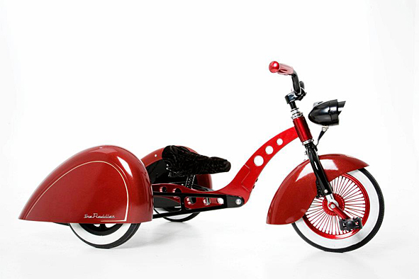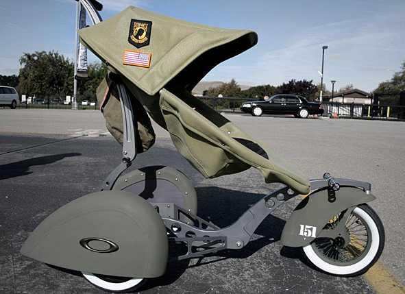what a great stroller: THE RODDLER from “kid kustoms”. and the best, when your kiddies are ready for their first hot rod just take the RODDLER chassis and transform your stroller to the “ENZO TRIKE” – genius! with endless possibilities to customize, but not really cheap as you can imagine. THE RODDLER ist a handbuilt “aluminium 6061 T6 grade stroller” which also features stainless hardware, kustom painted fenders, high grade leaterette upholstery, leafspring and hairpin suspension, adjustable handle bar, white wall tires and, and, and. check it: www.kidkustoms.com pics | kid kustoms