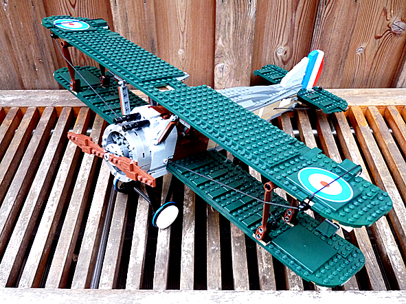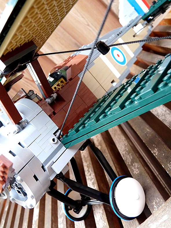 my son LEVI and me finished our next LEGO project: the SOPWITH CAMEL BIPLANE, a classic of aviation history, one of the most recognizable british single-seat biplanes. for us it was easy to stick the bricks and build it up compared to the V8 SUPERCAR from LEGO TECHNIC. the classic LEGOs are much easier in their complexity, but it was not so easy to put on all wires which have some real functions. the plane features a lot of details like a rotating propeller and engine cylinders, hinged tail rudder, functioning wing ailerons and tail flaps that can be controlled from the cockpit. it includes rare dark green, dark tan and metallic silver elements. the replica is 15″ long and a wingspan of over 19″. pics | LTG & theaircraft.net