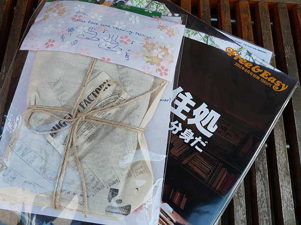 NEKO send me a parcel with the last and actual FREE & EASY issues plus an interior and house F&E special. this time she packed all the stuff in mega pink paper. great! it’s not my style but i was so surprised when i got it from the DHL man. creative idea and funny: FREE & EASY magazines in flashy pink paper with lots of wonderful and colorful HELLO KITTY stamps – super! but the best. damn, NEKO, you made me really happy with this awesome scarf from the RUGGED FACTORY you send me as a gift with the mags. thank you so much! absolutely my taste. again: THANK YOU! and guys, if you need a reliable “personal shopper” in TOKYO email me and i will give you NEKO’s address. pics | LTG