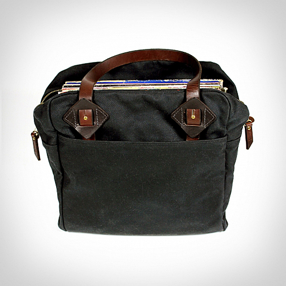 brand new and i think not only for DJs: the TANNER GOODS X ACE HOTEL RECORD TOTE. it is available for pre order and will be shipped from the 15th of december on. the tote is about 12.5″ long, 15″ high and 6.75″ wide. made of black waxed cotton combined with oxblood leather – english bridle amrican shoulder straps and zipper pulls – and brass hardware. adjustable shoulder straps from 11″ to 18.5″. the pockets inside the tote are made to fit LPs, 7 inches and a mixer. pics | ACE HOTEL