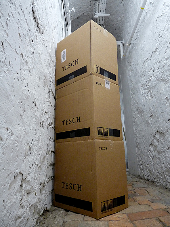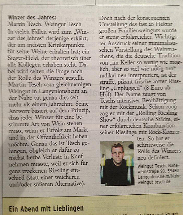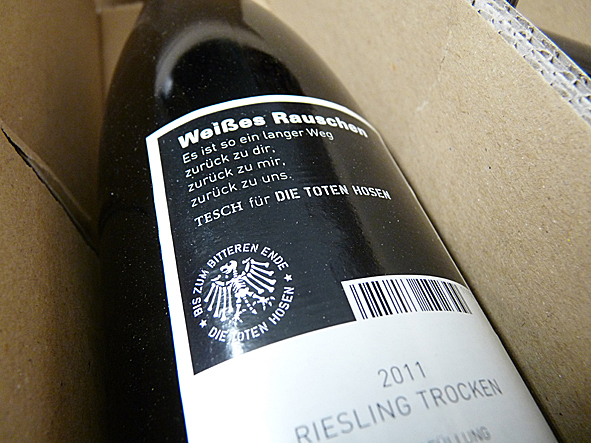 it is sunday and i am working like everyday since the last – i don’t know – weeks. but i had to do a break this afternoon. two weeks ago i got a new delivery from my favorite vineyard TESCH: some boxes RIESLING UNPLUGGED and WEISSES RAUSCHEN. this wine once was created by MARTIN TESCH as the tour wine of the DIE TOTEN HOSEN. both RIESLINGs i love so much because of their extremely pure, straight and fresh taste – even in winter! okay, i did a break and went to my wine cellar to put out the bottles of the boxes and sort them into my wine rack. this sort of work i love! nice detail: the box with WEISSES RAUSCHEN was closed with a KAUF MICH tape, the title of a vintage DIE TOTEN HOSEN album – very nice. and: CONGRATULATIONS TO TESCH because of decorated as WINEMAKER OF THE YEAR 2012/2013 by FRANKFURTER ALLGEMEINE. absolutely deserved! break is over now. and for this evening i took a bootle of UNPLUGGED 2011 with me. pics | LTG
