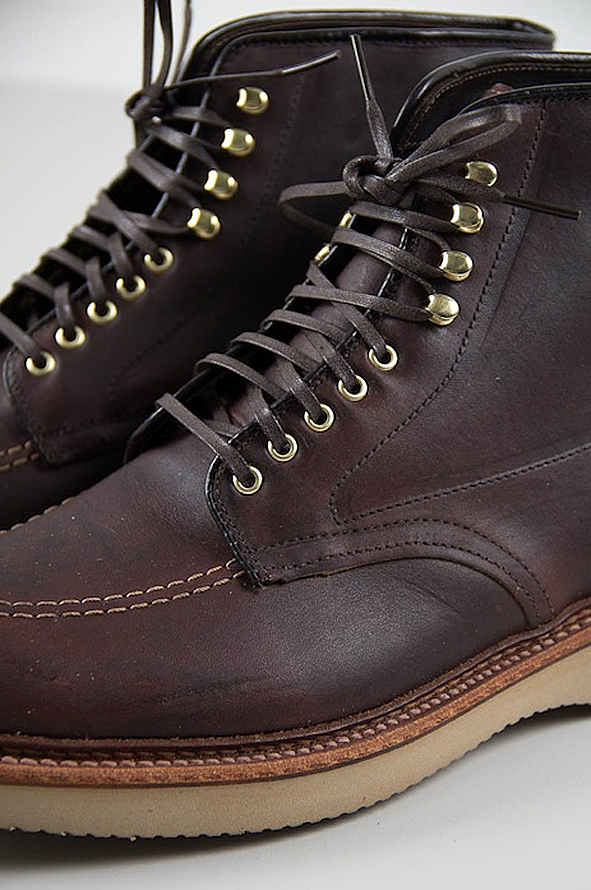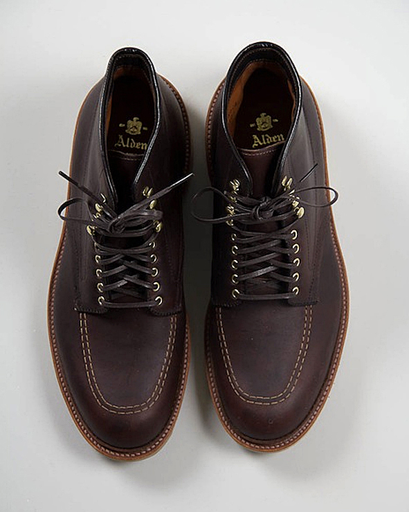 great ALDEN INDY BOOT modification by one of my most beloved shops THE BUREAU BELFAST. classic INDY in KUDU antelope leather with an oil finish on a fat #2021 VIBRAM sole, as you know my favorite sole. more INDY features: 5 brass eyelets and 4 speedhooks, flat waxed laces, contrast stitching on the toe, reverse split welt. awesome. most sizes available. pics | The Bureau Belfast