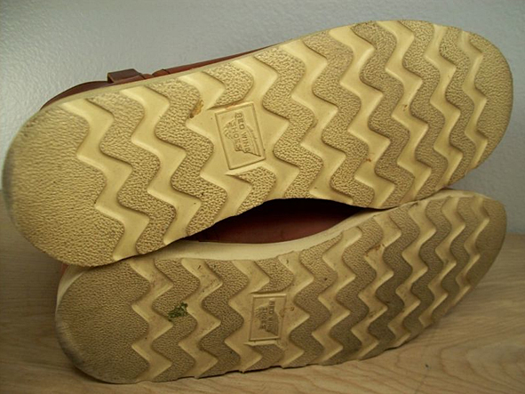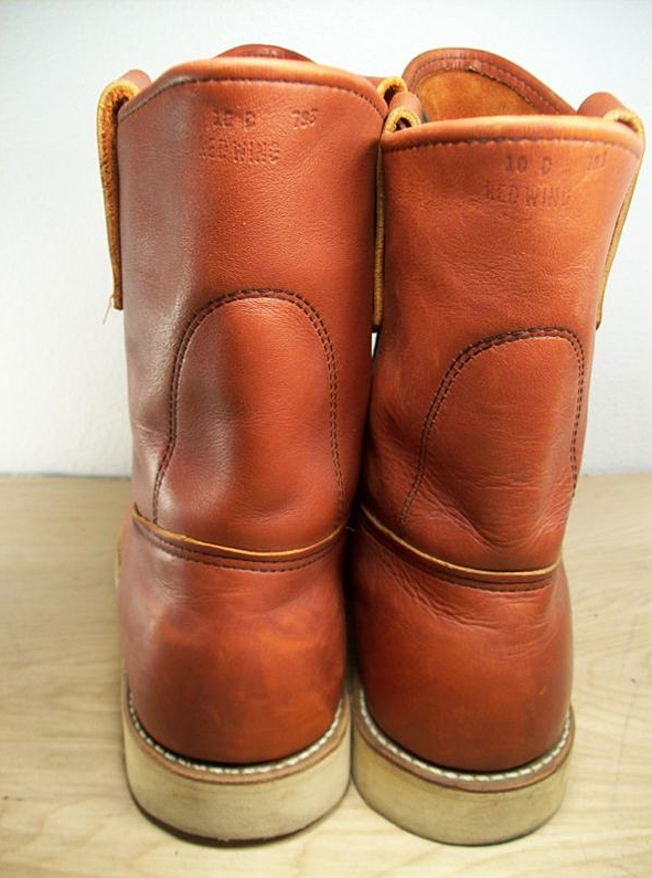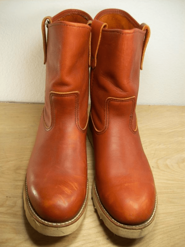 a rugged “BOB THE BUILDER” boot. i own one, too, a rare one in the same color, the classic beautiful RED WING ORO RUSSET PORTAGE but in much better condition. hard to find toady. you just can get the 866 PECOS in RED WING “ORO-IGINAL” leather color. this 1980s RWS boot shown here is really nice broken in. pics | groovy clothing shop