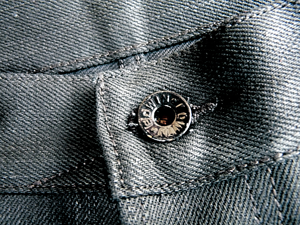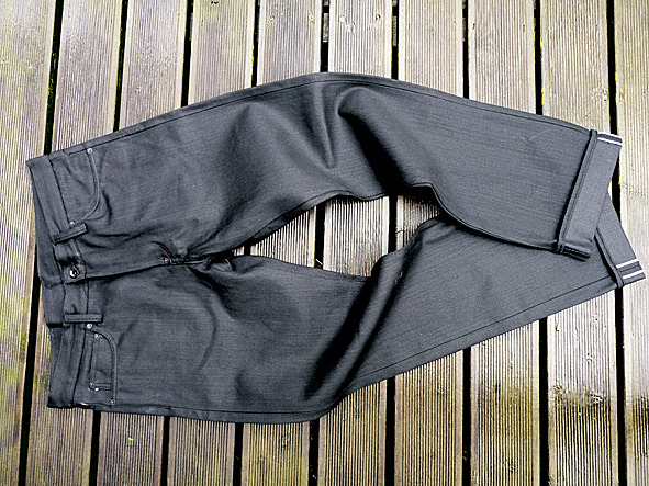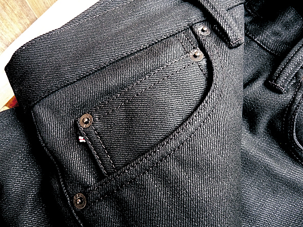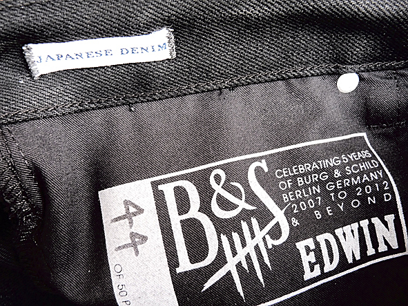 because of not being in berlin to join the 5th anniversary party of BURG & SCHILD i saved a lot of traveling money and so i ordered some anniversary stuff to celebrate this party with KAY, SHANE and TIM from out of my hometown. this mega black piece of denim is the second part of my order and i am really impressed about this. i never saw such a black denim before. the pockets are black twill and internally printed. with its 14oz. black/black red listed selvage denim from japanese mill, kaihara, it is very comfortable. and it has a lot of awesome details like the donut buttons, made from copper metal and hand panited with black enamel, or BURG & SCHILD leather patch that has been hand cut and hand embossed. i got number 44 of 100 limited pieces, numbered by hand – fifty pieces, 10 for each year B&S had been working with EDWIN. great idea and nice extra: every jeans comes in hand made tote bag made of recycled military ground sheets. everything is perfect, absolute … pics | LTG