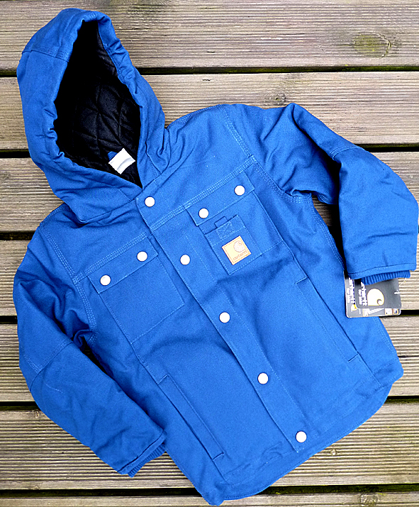 since my son LEVI is born i do every 2 years a big order CARHARTT FOR KIDS at DUNGAREES.NET. great stuff and not only because of good simple old school looking but because of the durability. LEVI is a boy who loves being outdoor and playing in the dirt without any attention if his wear gets dirty or even broken in. we have CARHARTT FOR KIDS shirts and sweat shirt jackets which are 4 years old and they still look perfect and good. and the best is, that you get this stuff for a really good price in the states. in europe you have no chance to buy CFK – no way. so this morning i went to the customs to get LEVI’s CFK order out. i bought some denim, dungarees – they are en detail like the ones for adults, uncommon size … – shirts for next summer and sweater. the most exciting piece is LEVI’s new fall and spring RANCHER JACKET in cobalt blue. quilted flannel lined and so smooth. i think, he will love it. check DUNGAREES.NET. CFK starts with baby sizes! pics | LTG