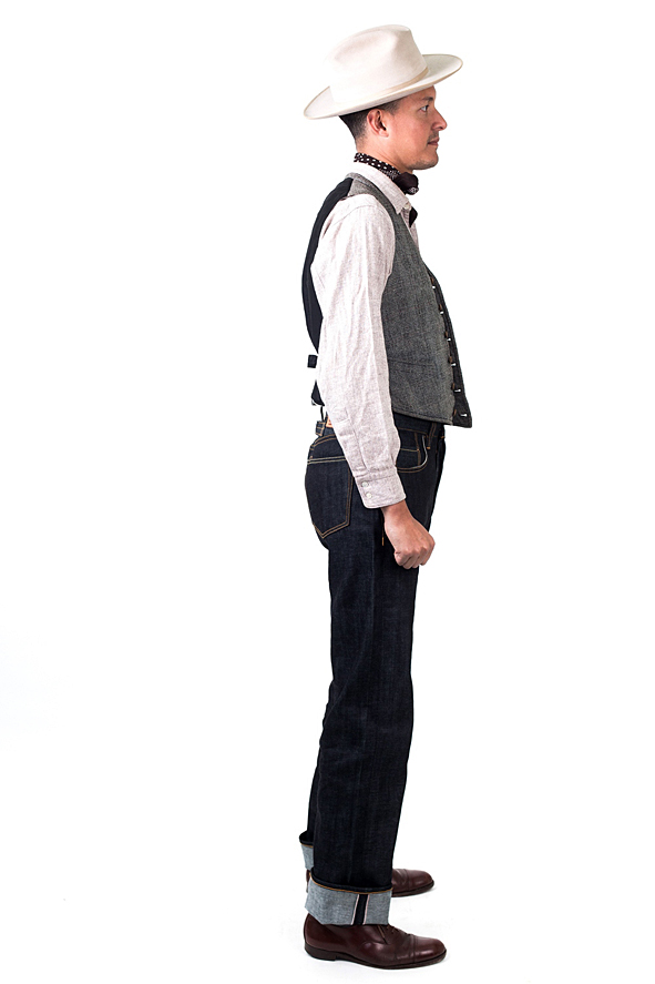one of my absolute favorite vests which gets better and better with every wear. it is made of selvage indigo – look at the nice details. i like this hunting styled vest with its cinch back and chambray lining. i own another raw brown duck outdoor vest from RISING SUN which is much stiffer but as nice as the indigo one. great american made stuff! pics | LTG