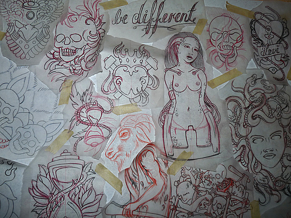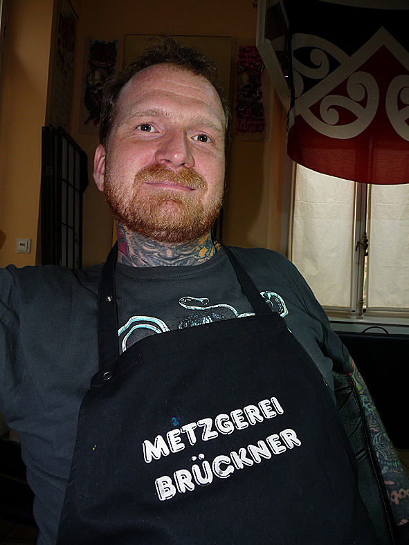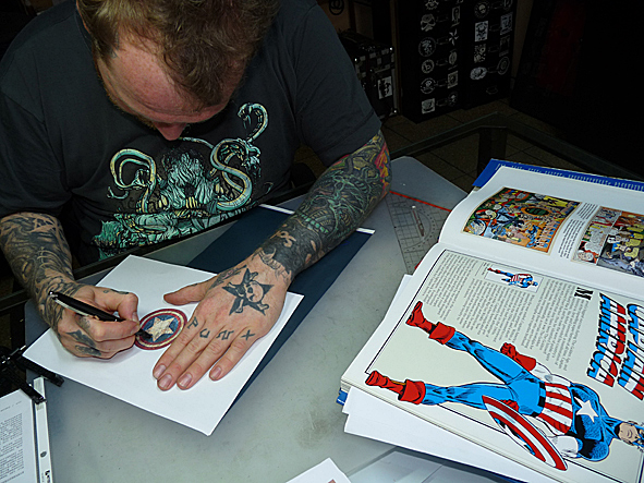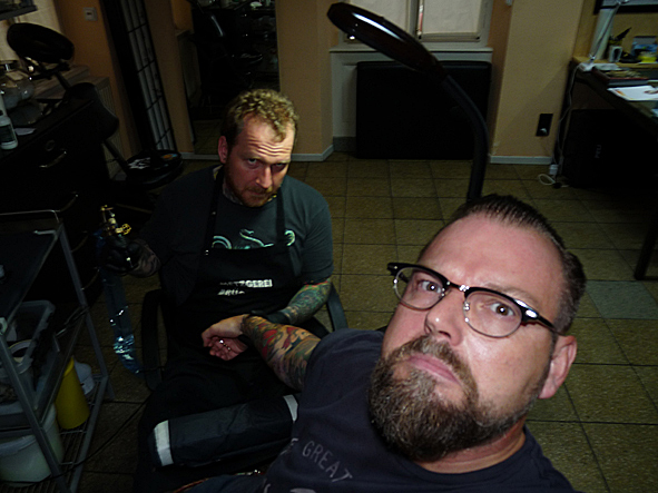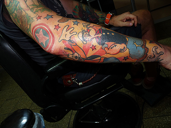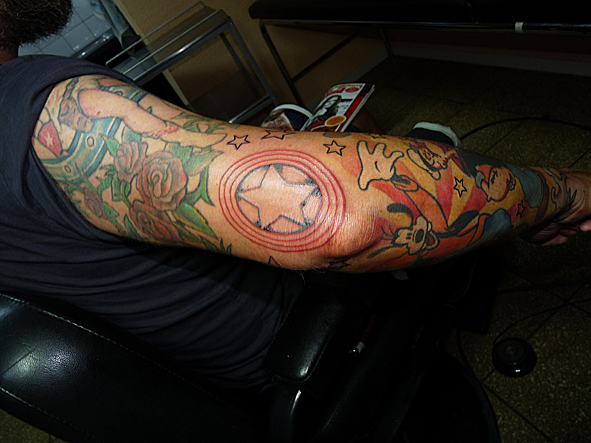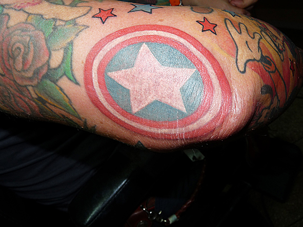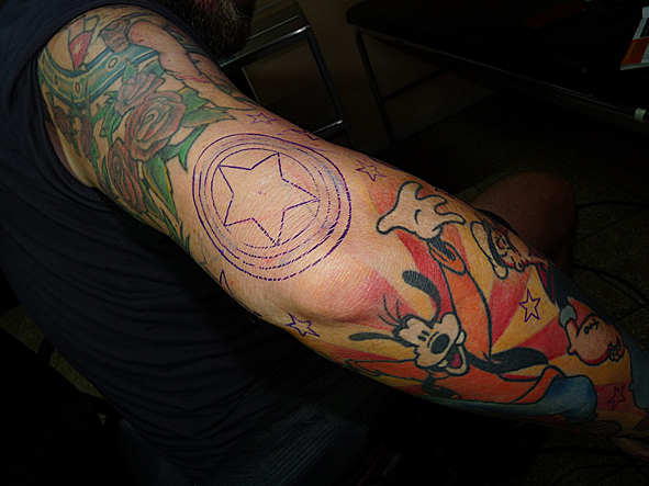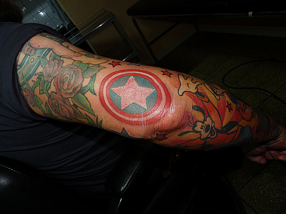 yesterday evening i went to BASTI c/o INKSIDE studio to get some new tattoos in order to complete my sleeve on the right arm. i wanted DONAL DUCK to say POPEYE, GOOFY and MICKY hello – but there wasn’t enough space for the duck head. so i decided to get the CAPTAIN AMERICA logo inked – a good decision: BIG LIKE! and i got some stars in blue, red and white around. so it is getting forward, but my next date will be in january 2013. BASTI is damned busy! in the year 2000 i went the first time to BASTI to get a cowboy pin up inked. we will renovate this tattoo next year … pics | LTG