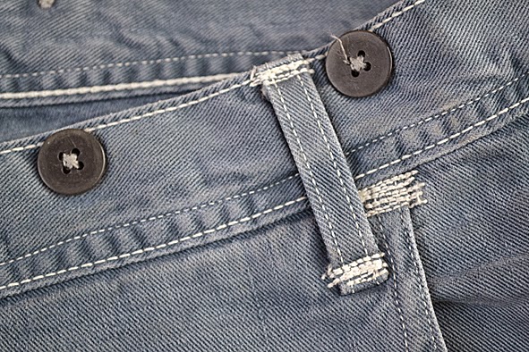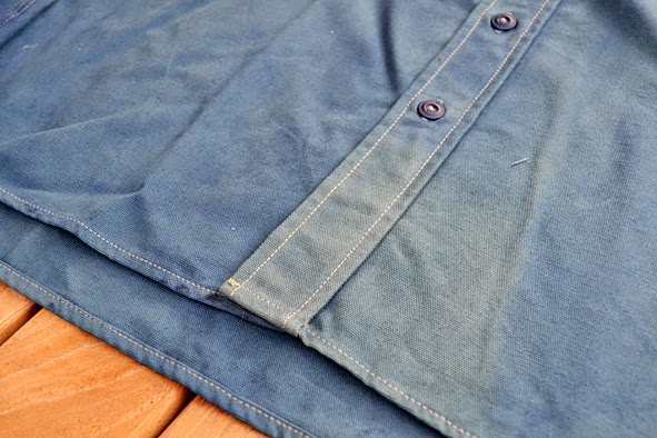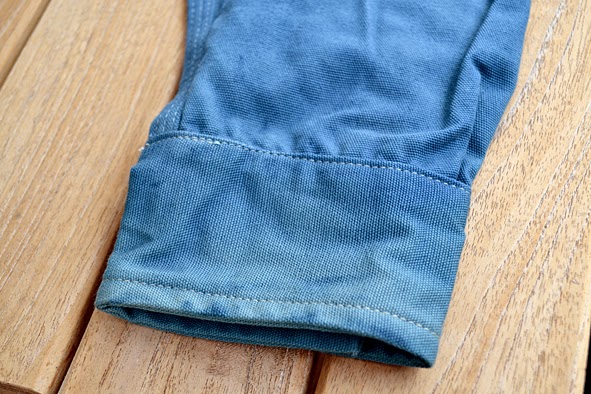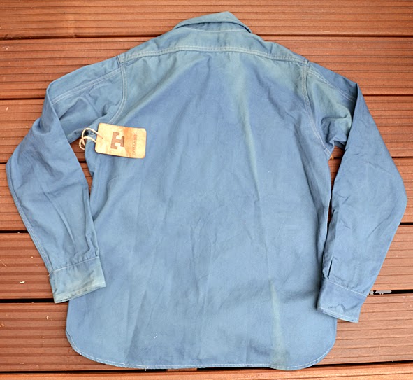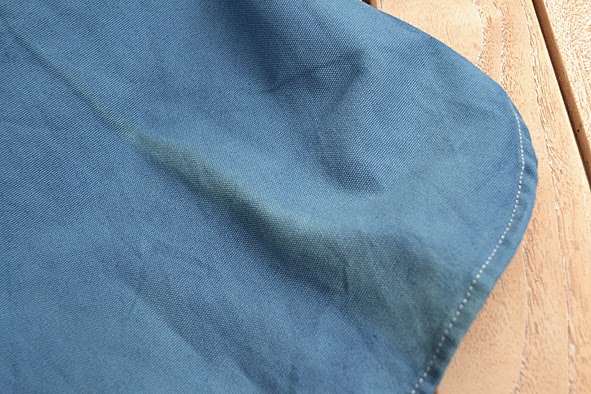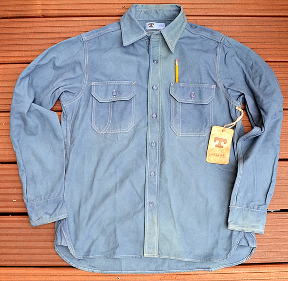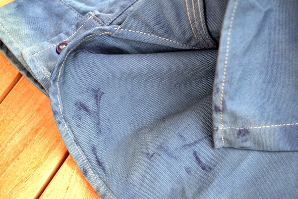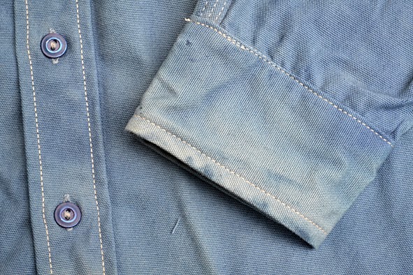 some weks ago i got this wonderful TELLASON shirt from UWE E.MAIER c/o AMTRAQ DISTRIBUTION. it is the classic 8 oz. canvas CLAMPDOWN shirt which was khaki before it was dyed with nature indigo. this was done by the crop-dye factory in NEUBRANDENBURG, germany which does all the indigo dyed MERZ B. SCHWANEN shirts. the first run was limited to 24 pieces … mine is #04. i love this irregular nature dying. you can get this shirt just at selected dealers here in germany f.ex. B-74 and RIDERS ROOM. i am very excited how the shirt will look like when it was washed the first time. i should to do this because of marking off – i will show you the result. here some facts of the CLAMPDOWN shirt: fabric made in USA by MOUNT VERNON MILLS, cut and sewn in SAN FRANCISCO, knife and pencil holders sewn into chest pockets, top flap of pocket lined with CONE MILLS WHITE OAK 7.5 oz denim. pics | LTG