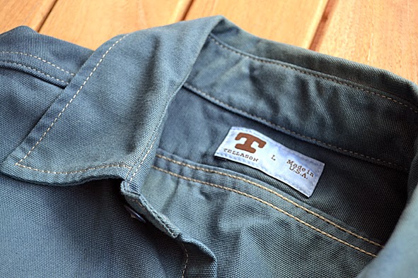 some weks ago i got this wonderful TELLASON shirt from UWE E.MAIER c/o AMTRAQ DISTRIBUTION. it is the classic 8 oz. canvas CLAMPDOWN shirt which was khaki before it was dyed with nature indigo. this was done by the crop-dye factory in NEUBRANDENBURG, germany which does all the indigo dyed MERZ B. SCHWANEN shirts. the first run was limited to 24 pieces … mine is #04. i love this irregular nature dying. you can get this shirt just at selected dealers here in germany f.ex. B-74 and RIDERS ROOM. i am very excited how the shirt will look like when it was washed the first time. i should to do this because of marking off – i will show you the result. here some facts of the CLAMPDOWN shirt: fabric made in USA by MOUNT VERNON MILLS, cut and sewn in SAN FRANCISCO, knife and pencil holders sewn into chest pockets, top flap of pocket lined with CONE MILLS WHITE OAK 7.5 oz denim. pics | LTG