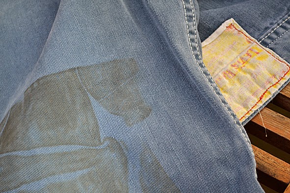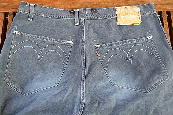 this is the second pair of LEVI’S RED denim i found in my box. the “HOLDEN” must be from 2003 or earlier. it has a wide carpenter fit, a classic workpant with no backriser and a high hem. straight leg, bearing two unequal slash pockets and knife pocket on the left side leg, black sew-on suspender buttons and uneven belt loops. this HOLDEN is made from 10oz sulphur-dyed twill fabric which gives this special light blue color and worn out look. unfortunately the jeans got marks from storage – i do not know how this could happen. found the same HOLDEN but brand new in japan for 340 US $. it is apitty that it got a bit too small … pics | LTG