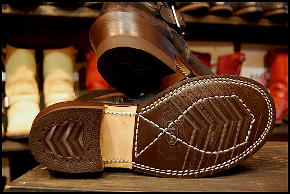awesome RWS engineer boot customized by japanese tokyo based BRASS. the 8268, i own one myself, looks really good with this fat BILTRITE CORD sole and a CATS PAWN heel – i like this style. pics | BRASS Tokyo & RAKUTEN