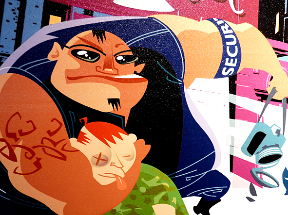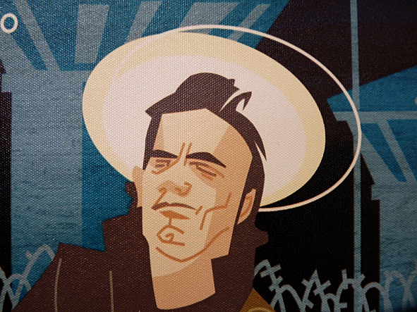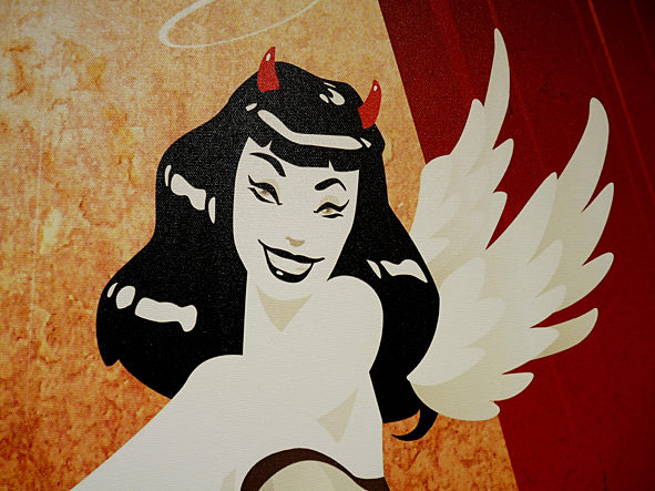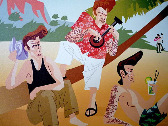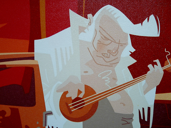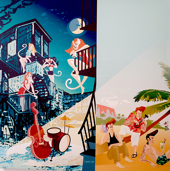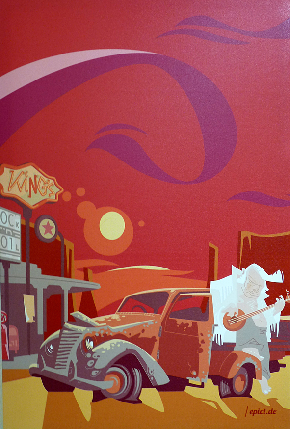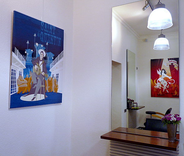 this morning i went to OLLI to get my hair cut refreshed. and i think it was time to take some photos of HANS JOERG BREHMS illustrations OLLI presents in his rooms. all illustrations are printed digital on canvas. they were made when HANS and me worked for DYNAMITE! MAGAZINE – the world of rock’n’roll. me as the art director and part of the chief editorial staff and HANS as an illustrator. i love the style HANS is illustrating: nothing but mainstream. a great contrast to the classic rock’n’roll motives. check HANS’ site. there you can see all this pics in better quality and much more! bad pics | LTG