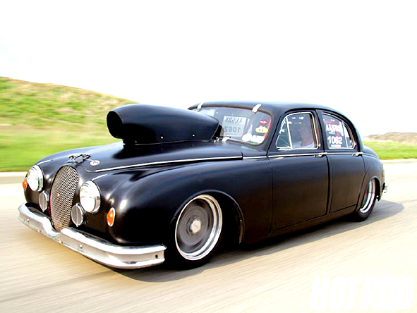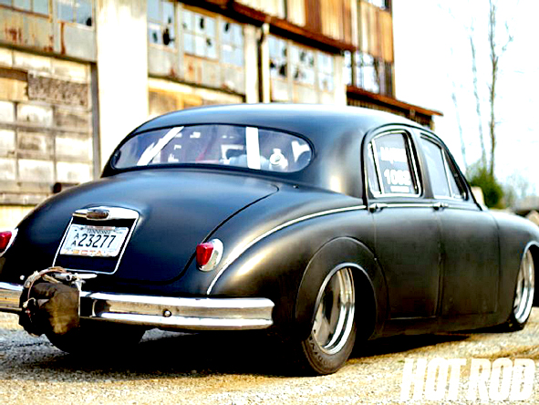 damn, a smart 1959 JAGUAR turned into a nasty beast. i think there are a lot of people hating me for writing this: i love this unusual look, this contradiction. british understantement turns into american muscle power … brilliant. to get some technical facts check HOTROD.com. pics | hotrod.com