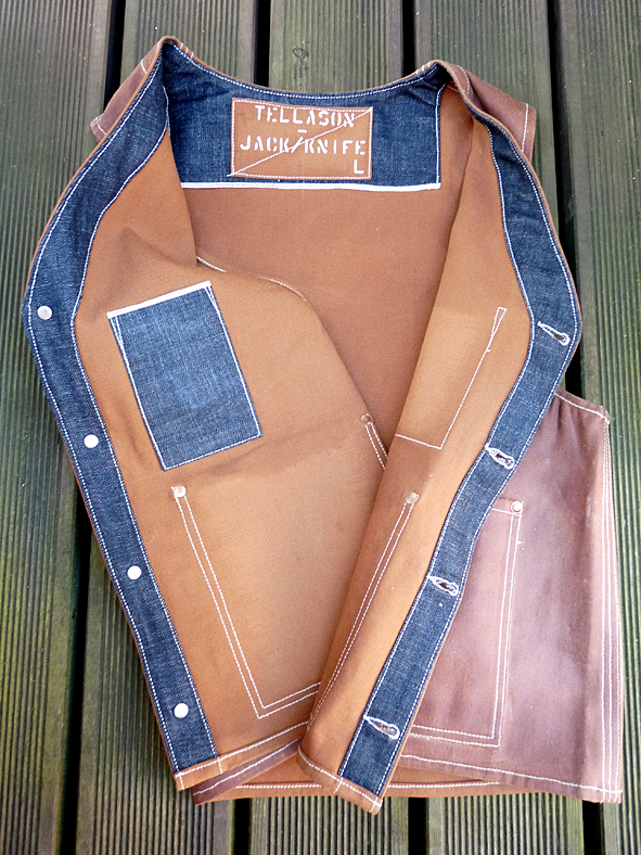 sorry for delay! it doesn’t took one day to show the other great reversible JACK/KNIFE jacket but a week. too much work, a f***ing cold … but here it is: the second J/K jacket made of 12oz. linen japanese selvedge denim and 13oz melton navy wool. i loved the touch of this piece when i had it at my office for taking the photos – just great. the buttons are so nice: hand carved and dyed for 3 times in indigo for a rich deep blue that will patina over time to reveal the natural ash wood look. the construction is 100 % the same as the J/K tweed jacket: a real reversible jacket that features vereything for both ways of carrying. no more words about the strictly limitation – you know this …