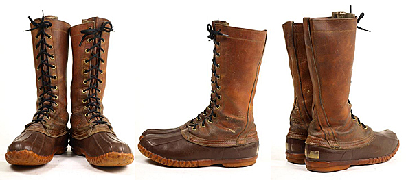 wonderful rugged MAINE HUNTING SHOES from L.L. BEAN. this style was LEON LEONWOOD BEAN’S very first product in 1912. the leather version was introduced 1932. this one here looks like from the 50s with a great patina but still in shape. i think it must be about 14″ high. great! found at japanese JAM shop via RAKUTEN. pics | JAM