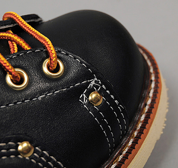 some facts: black oil-tanned leather, GOODYEAR storm welt construction (fully resoleable), engineered composite shank, removable “Dual Density Ultimate Shock Absorption” footbed on Poron 4000 Comfort Cushion, VIBRAM CHRISTY blown rubber wedge outsole, seam reinforcing rivets. certainly made in the USA. pics | HICKOREES