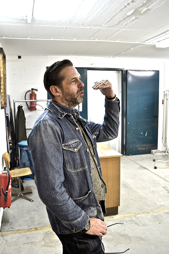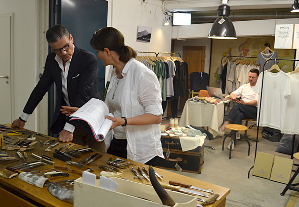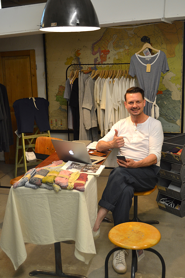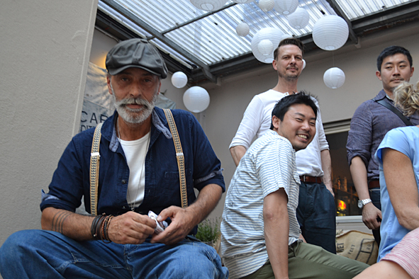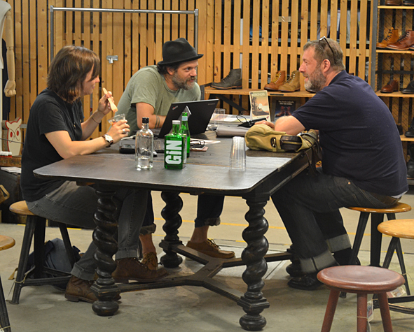 between all the heavy work these days i took the time to visit good friends and checked up some new stuff at wonderful arranged new showroom B-74 SHOWROOM FOR SELECTED BRANDS in frankfurt/main, germany, yesterday evening. f***! so great stuff. AMTRAQ (Tellason, Tanner Goods, DEHEN1920, TOPO Designs, Rising Sun, REDS, Golden Bear Sports wear, Croots England, L.I. Sounders, FEINSCHMUCK, Kay Heldsdörfer, Rancourt & Co), Levis Vintage Clothing, Levis Made and Crafted, Otter Wax, Merz b. Schwanen, Gitta Plotniki, Scarti Lab and Blue Blanket show their stuff for ordering in a really great atmosphere. KAMI’s B-74 is the right location for these brands and i think this won’t be the last time. it is difficult to tell you about my favorites. but really impressing were: RISING SUN, SCARTI LAB, Merz b. Schwanen, Blue Blanket and Golden Bear. the awesome FEINSCHMUCK stuff i knew and a lot of UWE E. MAIER’s AMTRAQ stuff too. most surprising was OTTER WAX. KAMI told me a lot about the different stuff they offer. from saddle soap to fragrances and beard oil. i was really impressed and i know that the beard oil and the forest smelling fragrance will find their way to my cupboard – damn good smelling! exciting was the new LVC collection: very-cowboy-look-a-like. but not traditional old school but for the 70s and 80s urban cowboy. difficult, but with some nice pieces. KAMI, Uwe, Dirk c/o MBS, Stefan, Andy … arranged a well tasting barbecue with a lot of cold drinks and so i’ve had a short but really smooth evening over the roofs of frankfurt. pics | LTG