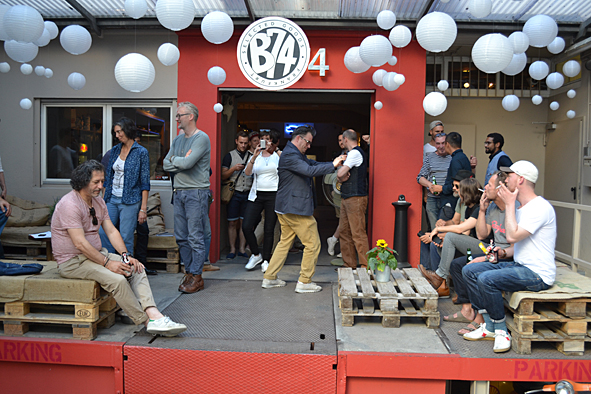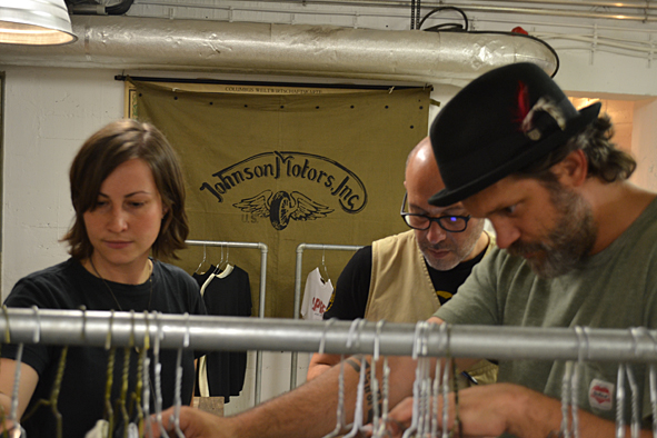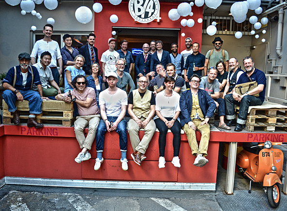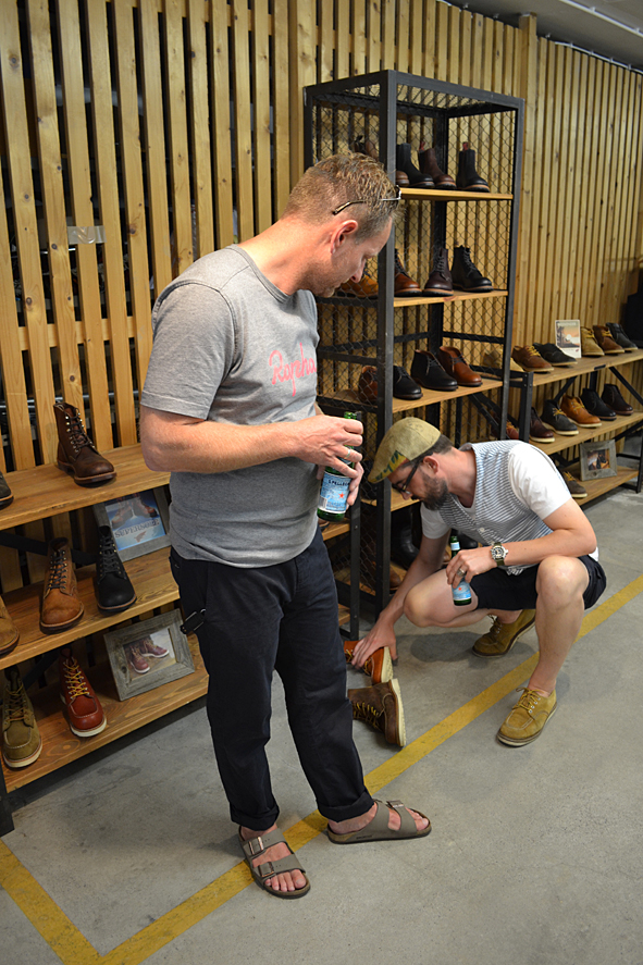 between all the heavy work these days i took the time to visit good friends and checked up some new stuff at wonderful arranged new showroom B-74 SHOWROOM FOR SELECTED BRANDS in frankfurt/main, germany, yesterday evening. f***! so great stuff. AMTRAQ (Tellason, Tanner Goods, DEHEN1920, TOPO Designs, Rising Sun, REDS, Golden Bear Sports wear, Croots England, L.I. Sounders, FEINSCHMUCK, Kay Heldsdörfer, Rancourt & Co), Levis Vintage Clothing, Levis Made and Crafted, Otter Wax, Merz b. Schwanen, Gitta Plotniki, Scarti Lab and Blue Blanket show their stuff for ordering in a really great atmosphere. KAMI’s B-74 is the right location for these brands and i think this won’t be the last time. it is difficult to tell you about my favorites. but really impressing were: RISING SUN, SCARTI LAB, Merz b. Schwanen, Blue Blanket and Golden Bear. the awesome FEINSCHMUCK stuff i knew and a lot of UWE E. MAIER’s AMTRAQ stuff too. most surprising was OTTER WAX. KAMI told me a lot about the different stuff they offer. from saddle soap to fragrances and beard oil. i was really impressed and i know that the beard oil and the forest smelling fragrance will find their way to my cupboard – damn good smelling! exciting was the new LVC collection: very-cowboy-look-a-like. but not traditional old school but for the 70s and 80s urban cowboy. difficult, but with some nice pieces. KAMI, Uwe, Dirk c/o MBS, Stefan, Andy … arranged a well tasting barbecue with a lot of cold drinks and so i’ve had a short but really smooth evening over the roofs of frankfurt. pics | LTG