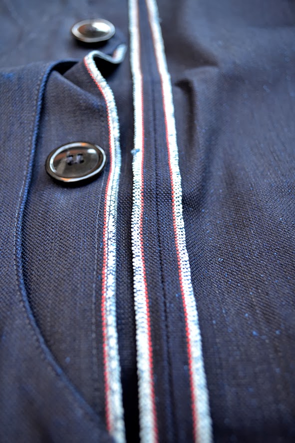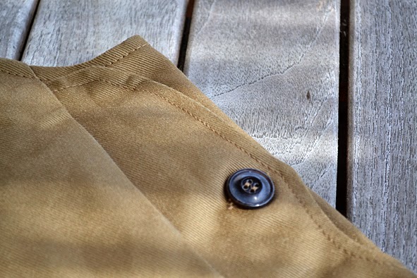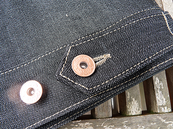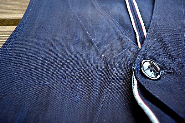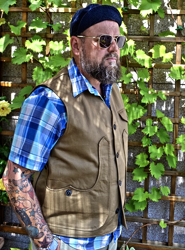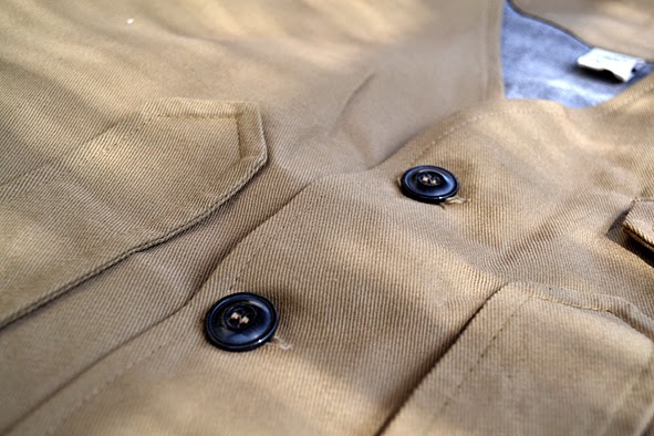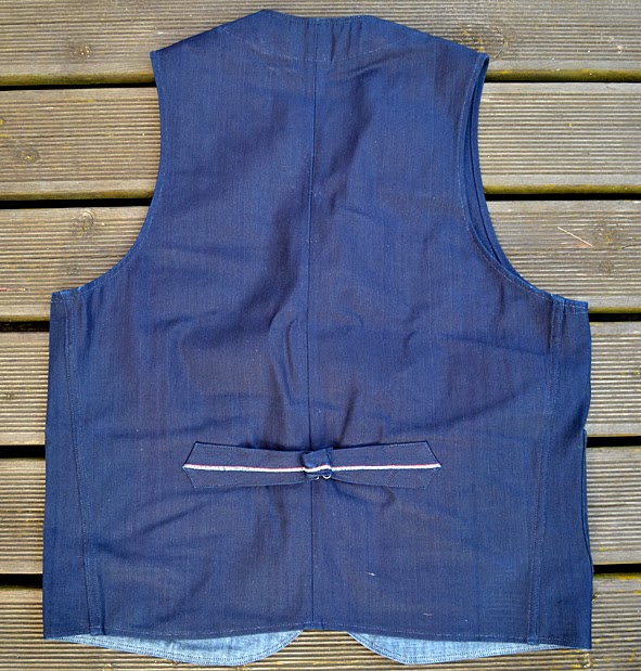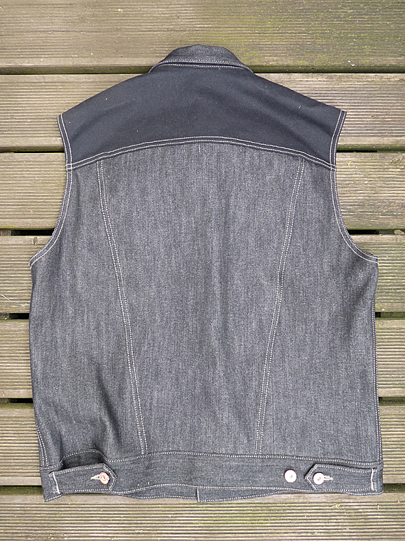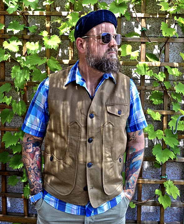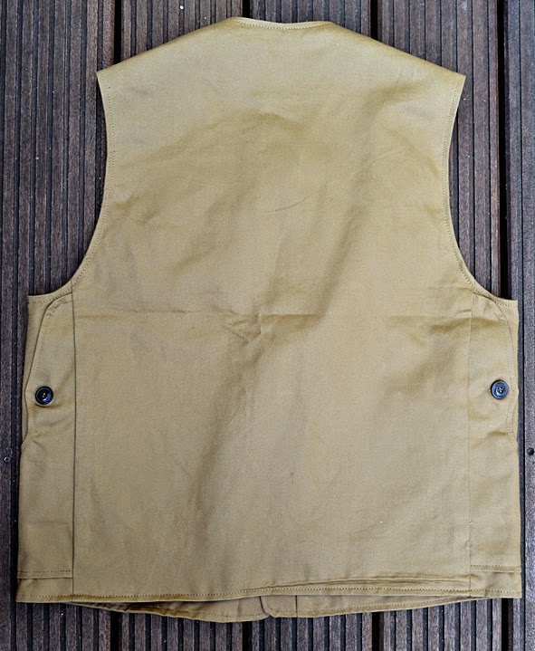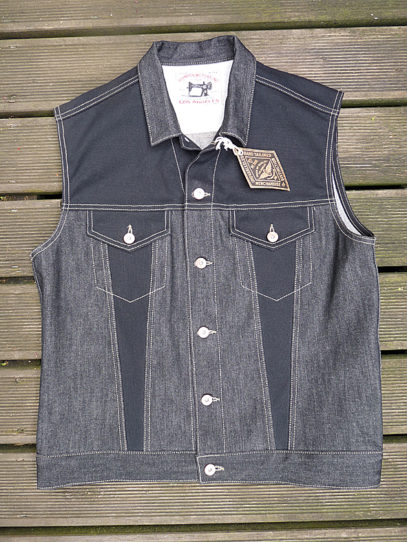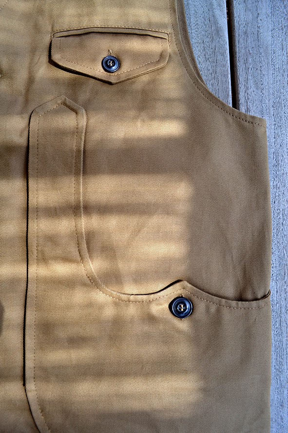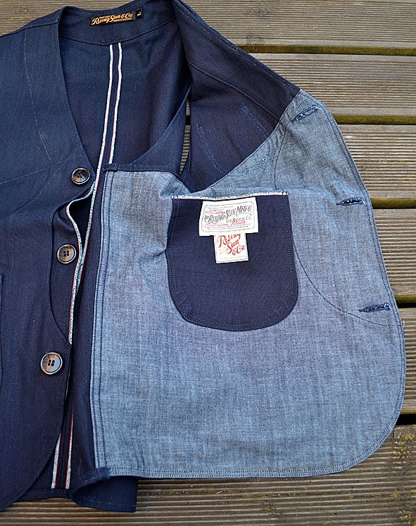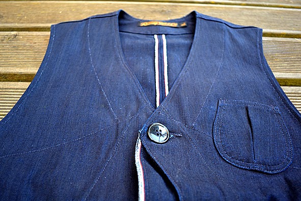 one of my absolute favorite vests which gets better and better with every wear. it is made of selvage indigo – look at the nice details. i like this hunting styled vest with its cinch back and chambray lining. i own another raw brown duck outdoor vest from RISING SUN which is much stiffer but as nice as the indigo one. great american made stuff! pics | LTG