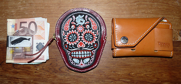… or how to transport money. some blogs ago i showed you the skull coin purse from SASQUATCHFABRIX EOTOTO which i bought at LN-CC, london. i use it now for some weeks and it makes fun and sense in combination with TANNER GOODS’ business and credit cardholder in saddle-tan and – one of my absolut favorit pieces – the CXXVI “WHALE” money clip. for years i used and rugged my beloved RED MOON wallet; so this one needs a longer break. and UWE bring TANNER GOODS to B-74 and VOLLS – thanks! bad pics | life time gear
