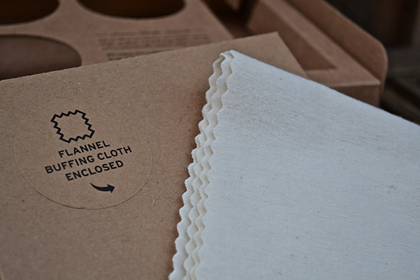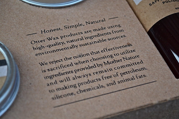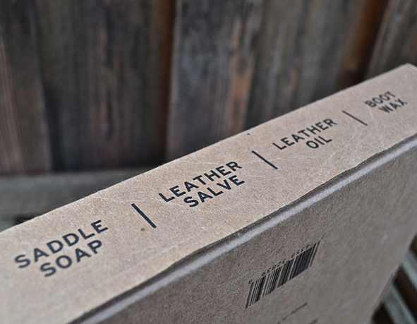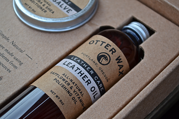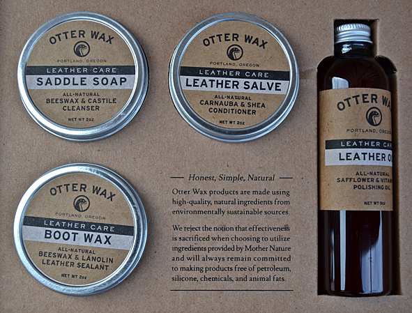 What a nice box design and even better the content – 4 OTTER WAX products for your boots, leather jackets, belts, for really everything made of leather: Saddle Soap, 2oz, Leather Salve, 2oz, Leather Oil, 5oz, Boot Wax, 2oz, Flannel Buffing Cloth. So this kit contains all 4-Steps to comprehensive leather care! All products are made with natural ingredients to ensure that they work with all types of leather. Made in Portland, Orgeon.